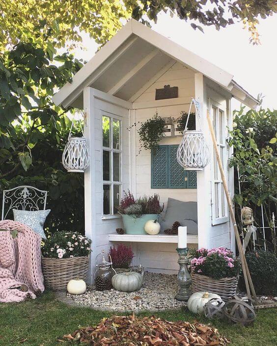 Place a few small gourds or white pumpkins around the entrance for a subtle touch of fall. Don’t forget to hang lanterns or fairy lights to make your garden house sparkle as the evening sets in.