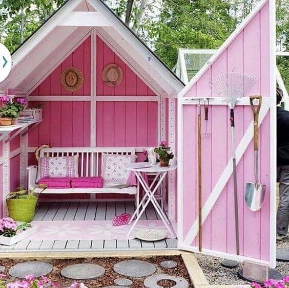 This cheerful pink garden house feels like something straight from a fairytale. The bright pink walls, white trim, and sweet floral accents create a joyful and welcoming retreat.