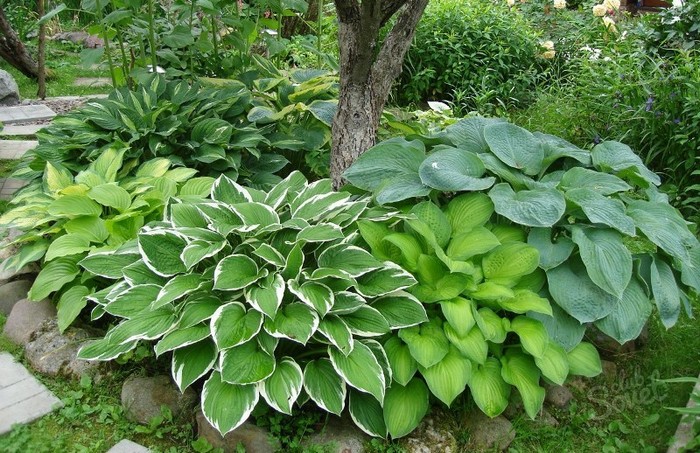 Dans un endroit bien éclairé et légèrement ombragé, des variétés à bordure jaune peuvent être plantées, car des coups de soleil apparaissent sur les feuilles émeraude des hostas si la lumière est trop vive. Mais dans les coins les plus sombres, sous les arbres, la vivace se sent bien, surtout pour les variétés “bleues”.