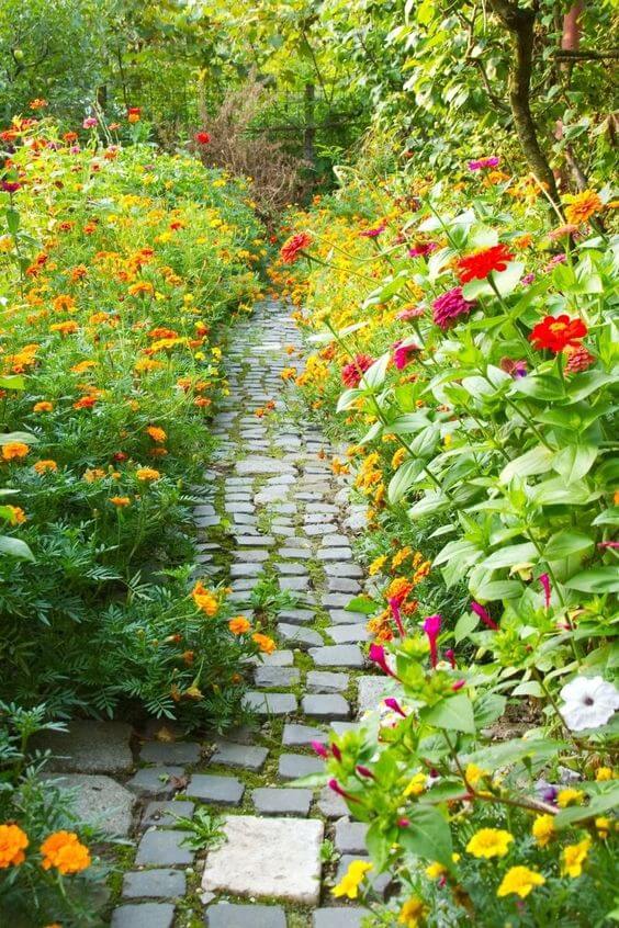 This narrow path is made of small cobblestones tucked between dense flowerbeds on both sides. It runs through bright blooms in a natural, slightly wild layout that feels charming and inviting.