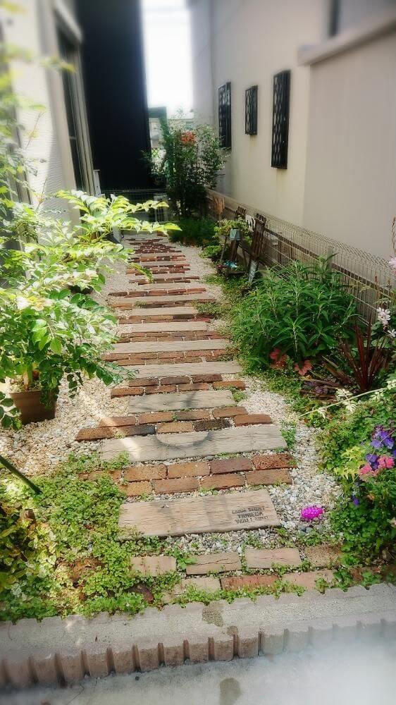 This garden walkway fits snugly between two buildings, using a mix of red bricks and wooden planks set into gravel. The narrow space is softened with greenery on both sides and a few blooming flowers.
