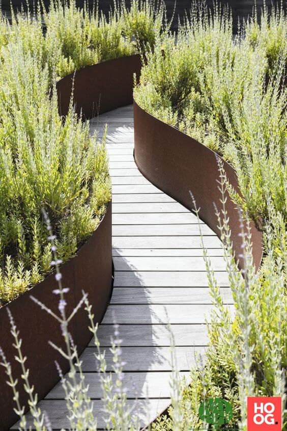 This winding path uses slats of green-painted wood arranged in a flexible, curved layout. The color blends well with nearby plants while still adding an unexpected element.