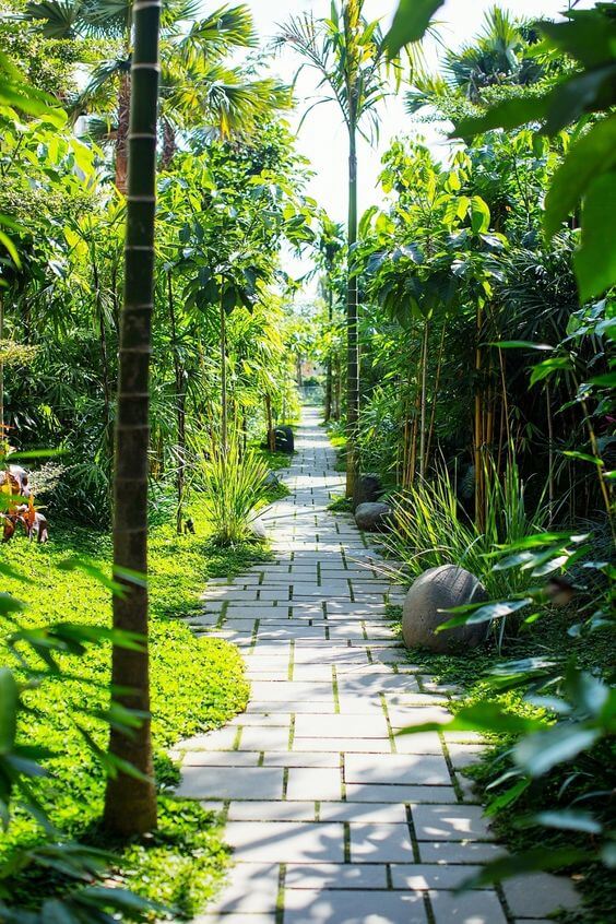 As you walk through, the tall palms and bamboo create a peaceful escape that feels like a private retreat. The path’s light surface contrasts nicely with the deep greens, making it easy to follow without overpowering the garden.