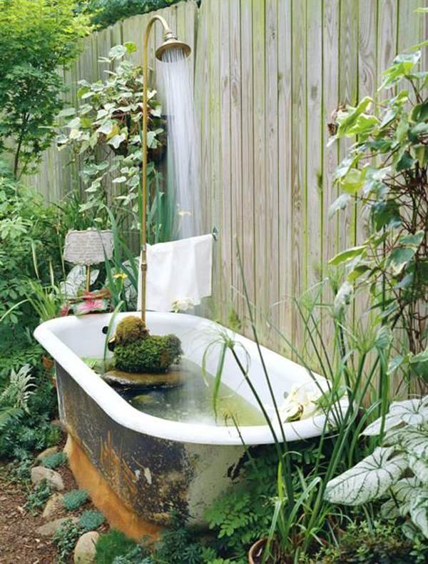 Convert an old bathtub into a pond by adding water, plants, and small fish.