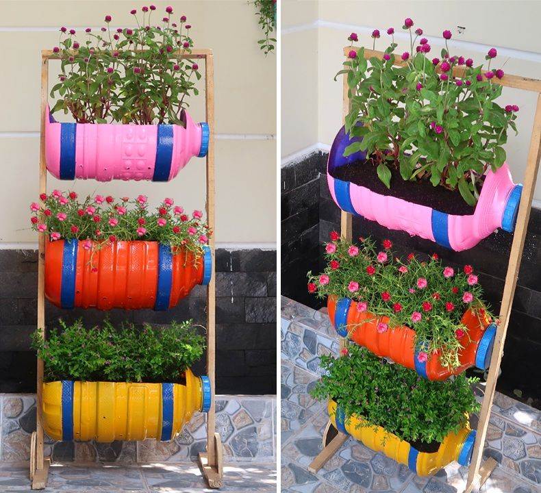 Cut off the bottoms of plastic bottles, fill them with soil, and hang them vertically to create a space-saving garden.