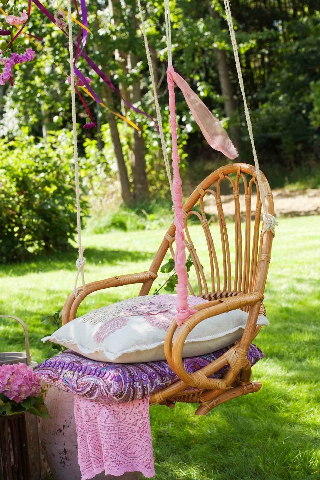 Remove the legs of an old chair, add sturdy ropes or chains, and hang it from a tree branch to create a charming swing.