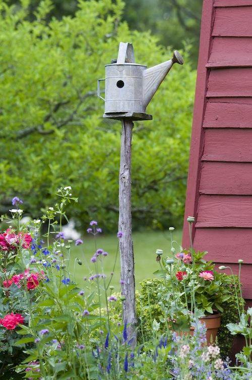 Repurpose old teapots, boots, or tin cans into unique birdhouses and hang them in your garden.