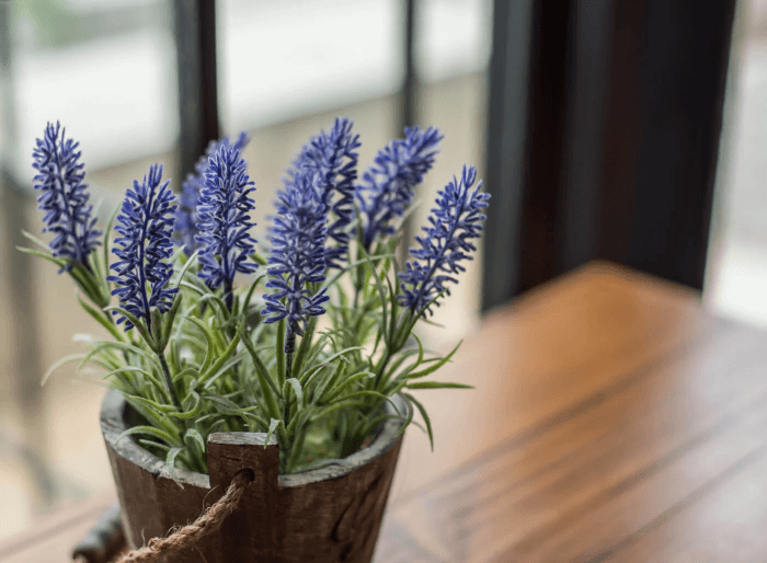 Lavender instantly adds calm with its soothing scent and silvery-green foliage. Compact varieties do well indoors when placed in a sunny spot. Use well-draining soil and water lightly, as lavender dislikes soggy roots.