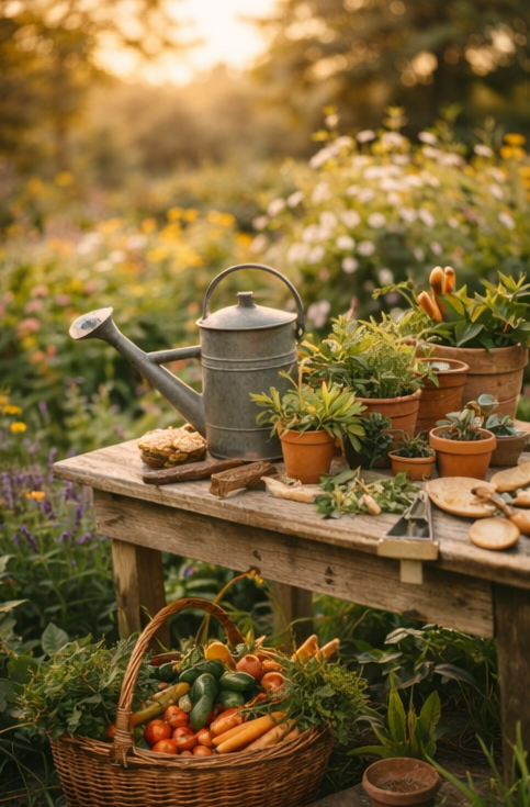 Garden Harvest Table | Fresh Vegetables & Watering Can