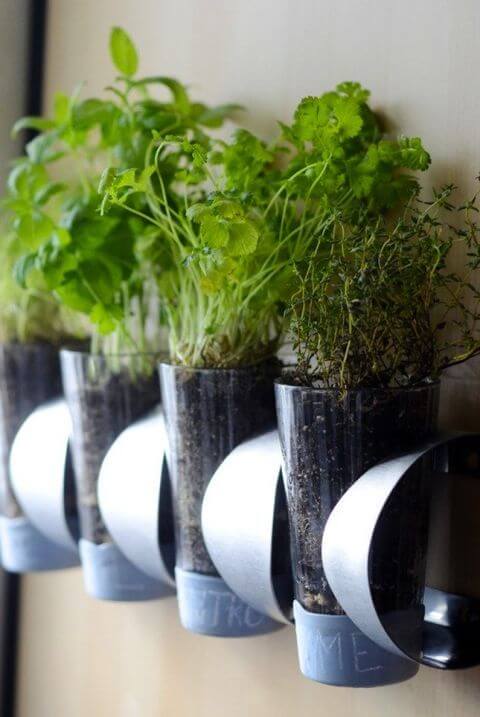 Each bottle holds just enough soil for herbs like cilantro, basil, or thyme. Keep the bottles well-drained by adding small stones at the bottom, and mist the herbs often to keep them happy.