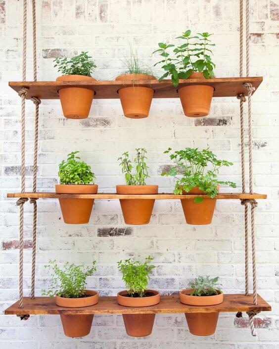 This rustic hanging garden turns old-school terracotta pots into a cozy, eye-catching display. A thick rope suspends wooden shelves with perfectly cut holes that hold each pot securely in place.