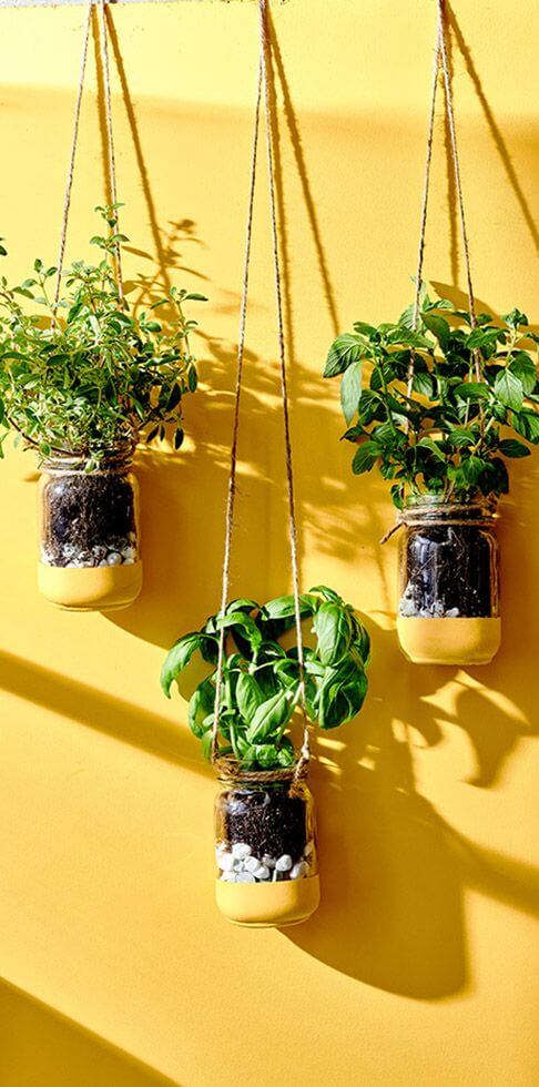 This sunny, vibrant setup transforms simple mason jars into a cheerful vertical herb garden. Each jar is half-dipped in yellow paint to echo the warmth of the background wall, while jute rope suspends them at staggered heights, creating a playful rhythm.