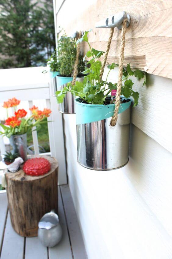 This eye-catching setup turns plain paint cans into polished herb planters with a modern twist. A pop of color at the rim brings personality, while the rope and cleat combo gives it a sturdy, nautical vibe.