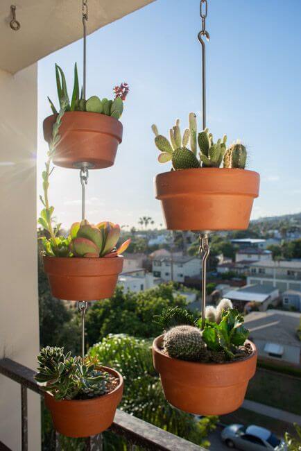 Stacked vertically with clean lines and natural charm, these hanging clay pots bring a warm, rustic touch to any balcony or patio. The setup is perfect if you’re tight on space but want a full mini succulent garden.