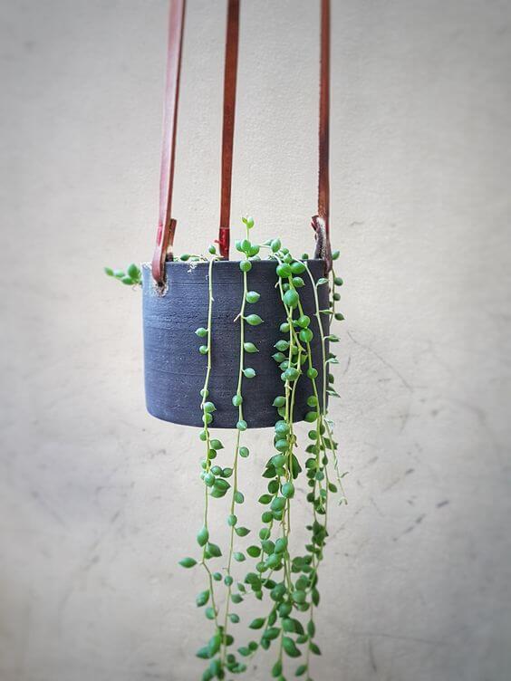 Simple yet striking, this black planter paired with leather straps adds a modern edge to your greenery. It’s an elegant way to showcase trailing succulents like string of pearls or burro’s tail