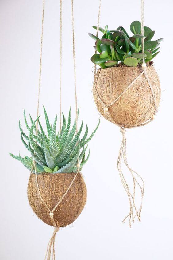 To make your own, clean out a coconut half, drill a few drainage holes, and tie it up securely with twine or natural rope. A small layer of pebbles at the bottom will help prevent soggy roots.