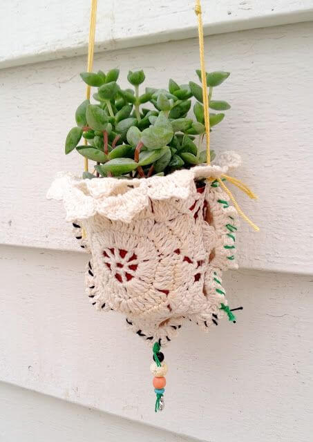 This charming planter feels like it came straight from grandma’s craft basket. Made from a crocheted doily or lace square, it creates a soft, vintage-inspired pocket that cradles your favorite succulent.