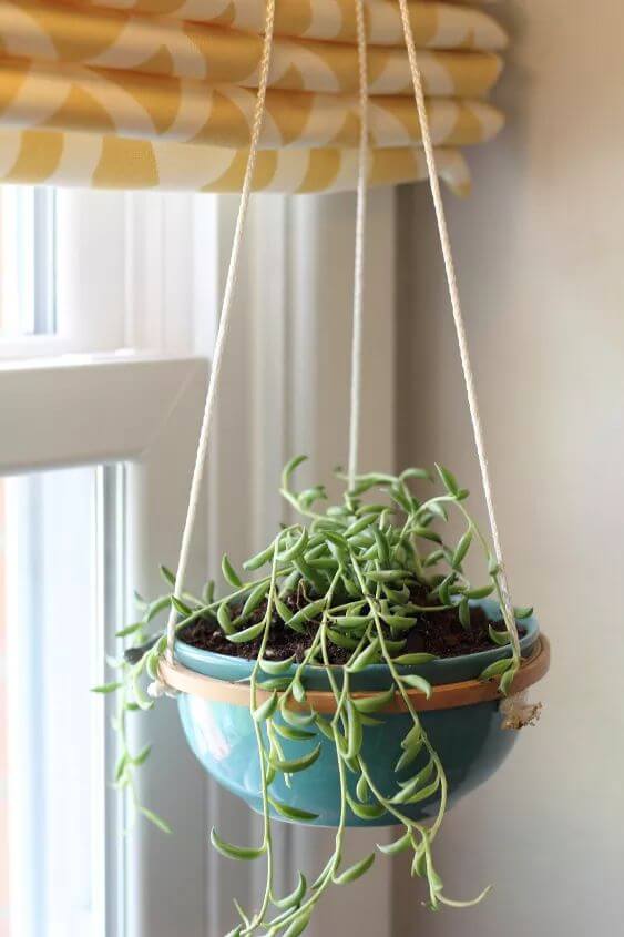 This simple hanging bowl brings a splash of life right into your window. A ceramic dish, some sturdy rope, and a sunny corner are all you need to get started. Choose a trailing succulent like string of bananas or burro’s tail for a cascading effect.