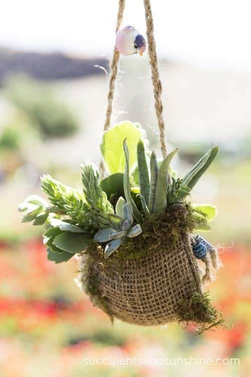 To make one, fill a small lined burlap pouch with cactus soil, add your favorite mix of succulents, and secure it with twine.