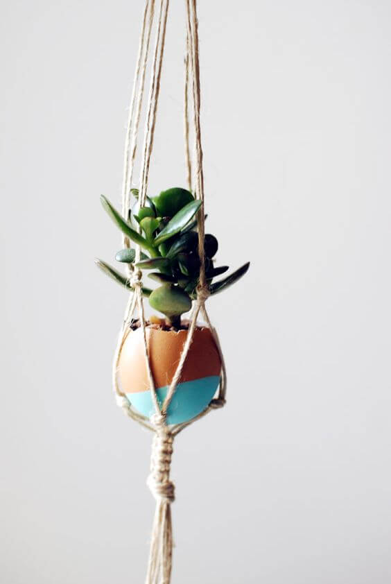 To make one, gently crack and clean an eggshell, paint it with your favorite colors, and fill it with a bit of soil and a small succulent cutting. Use jute or cotton twine to create a simple knotted holder that keeps it snug.