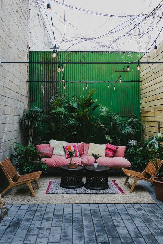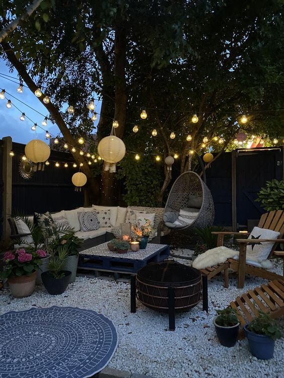 Hang string lights above the seating area to create a cozy and enchanting atmosphere. String lights can be draped from trees, a pergola, or posts around the seating area. Make sure they are weatherproof and LED for energy efficiency.