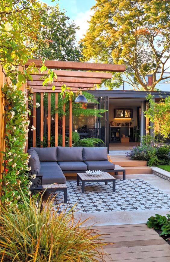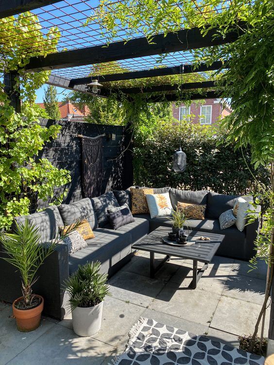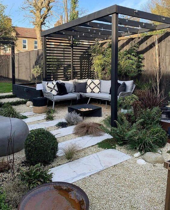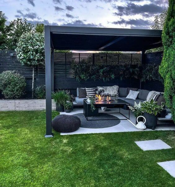 #13 A Pergola Design with Black Color Furniture And A Low-maintenance Landscape