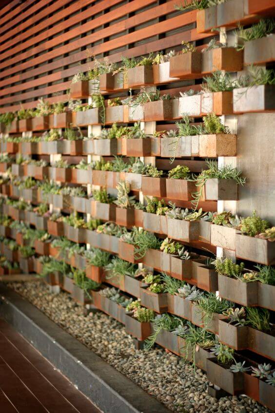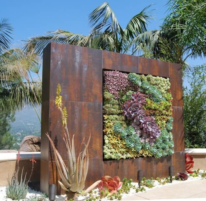 A metal frame filled with succulents creates a modern, industrial-style feature. Use small compartments or welded boxes to hold soil and plants.