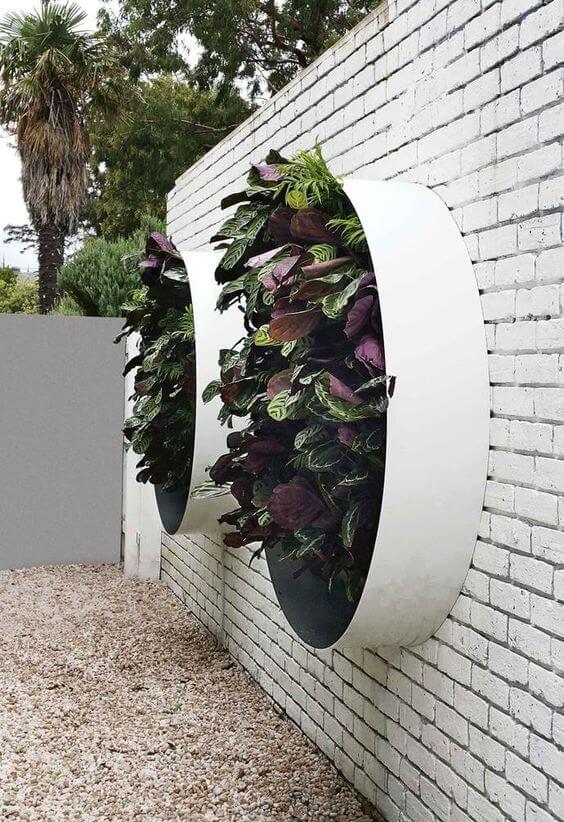 The symmetry adds balance while the greenery softens the structure. Hang it on a fence or exterior wall to give your garden a modern, stylish touch. Keep plants trimmed so the circle shape stays sharp and eye-catching.