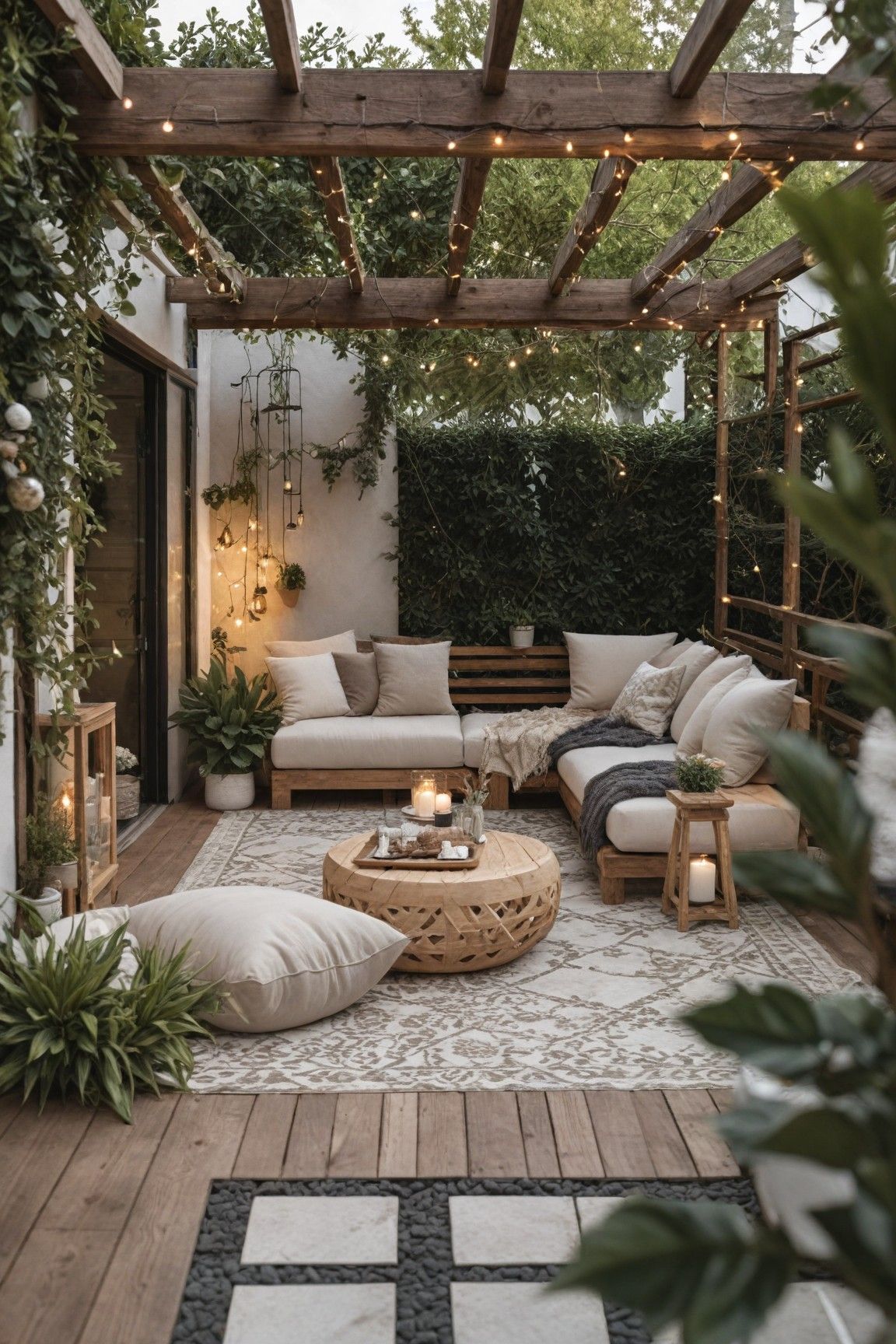 Modern Outdoor Patio with Wooden Pergola and String Lights