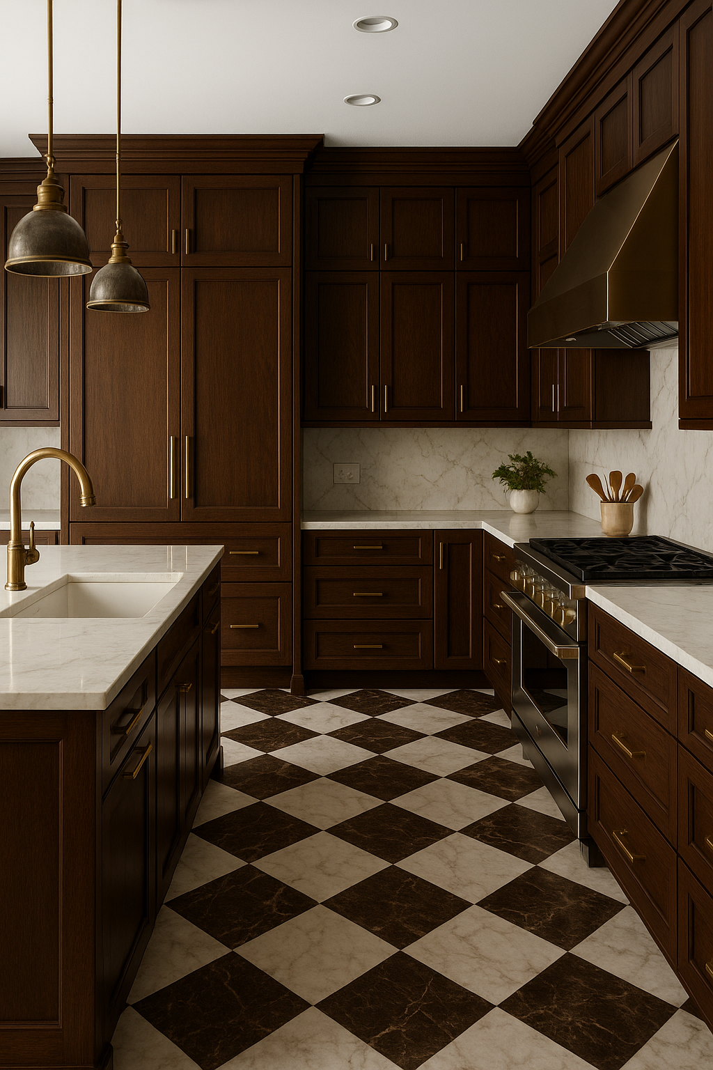 Moody Walnut Kitchen Design with Marble Backsplash & Checkerboard Floors