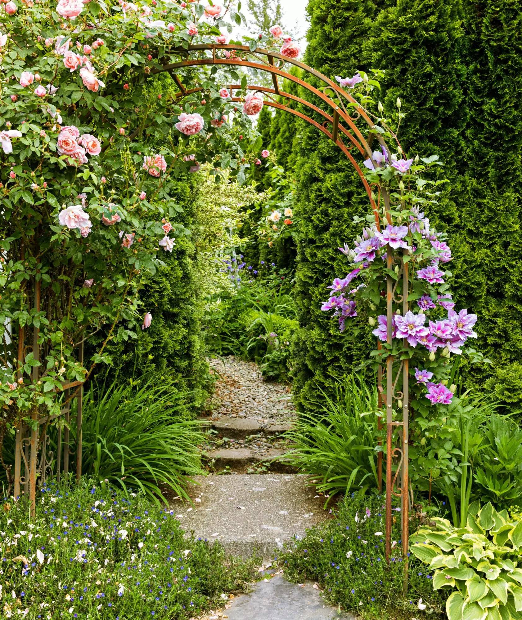 Grow chocolate vine over an archway, offering shade and beautiful cascading flowers.