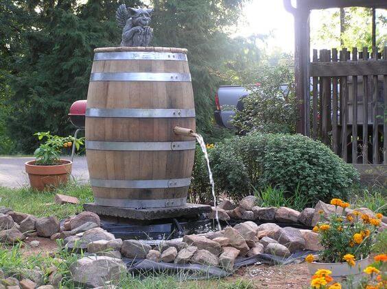 #6 Rustic Water Feature Using An Old Well Pump, Wine Barrel, And Railway Sleepers