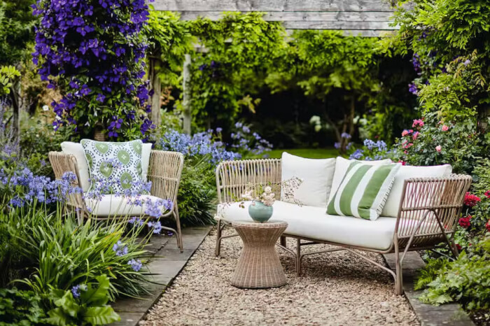 Next, we would introduce to you some green sceneries that blend perfectly with traditional garden styles. Those may include outdoor elements such as sofas, benches, arbors, and light strings for chilling moments with comfortable seats and lighting.