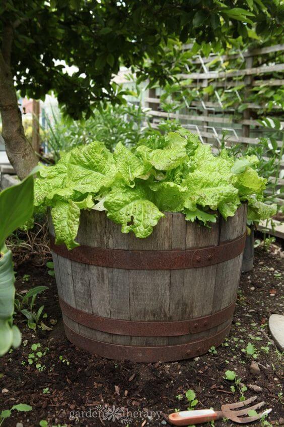 Wine barrels are excellent for growing lettuce and other leafy greens. Cut planting holes along the sides to maximize space. Fill the barrel with rich compost and plant your seeds or seedlings.