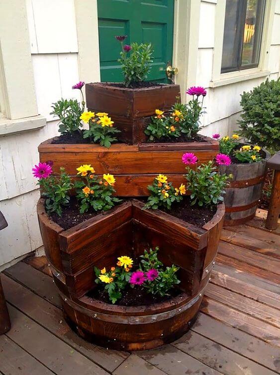 Stacking sections of wine barrels creates a beautiful tiered planter. This design is perfect for growing herbs, strawberries, or cascading flowers.