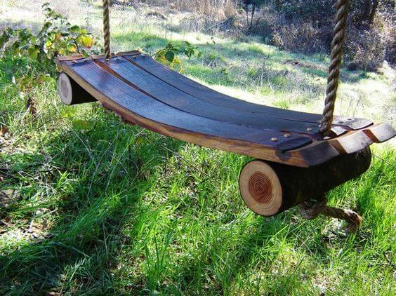 Give your backyard a playful twist with a barrel swing. Cut the barrel in half and sand down the edges for safety.