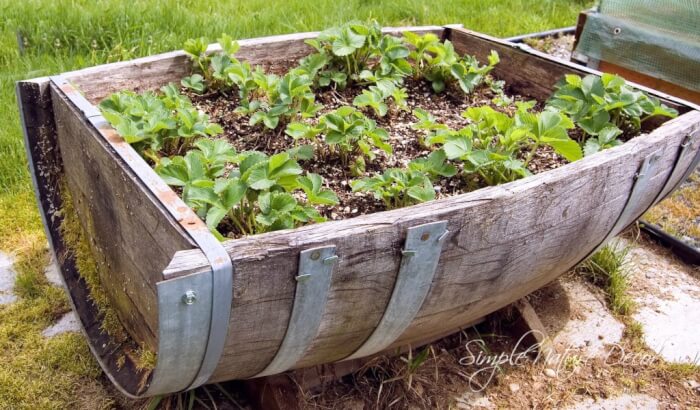 Strawberries grow beautifully in a wine barrel planter. Drill holes along the sides so plants can grow outward. Fill the barrel with rich soil and plant strawberries at different levels.