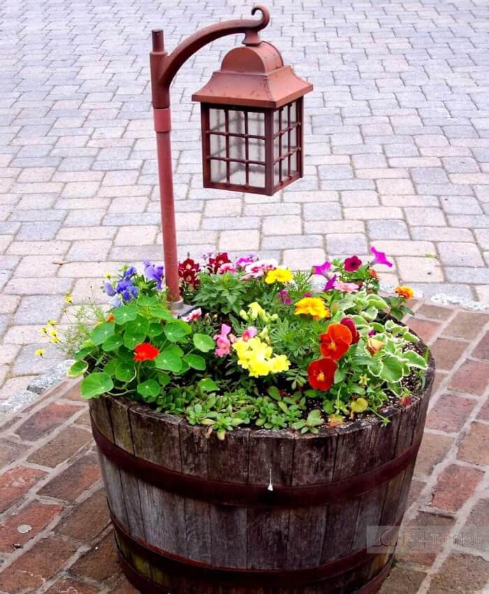 Wine barrels can even become the base for outdoor lamp posts. Secure the lamp in the center and fill the barrel with soil, stones, or flowers. This adds both light and decoration to your pathways or patio.