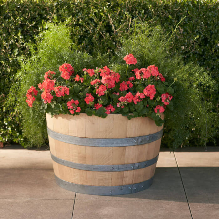 Wine barrels are large enough to hold a full arrangement of flowers. Group different seasonal blooms together for vibrant displays. Drill drainage holes before planting to protect the roots.