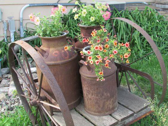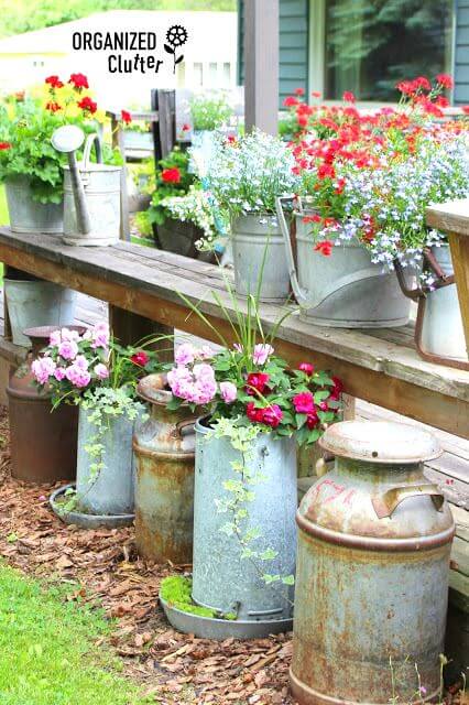 Transform old milk cans into charming planters that blend vintage charm with colorful blooms. Fill each can with soil and a mix of petunias or other vibrant flowers to create an eye-catching display.