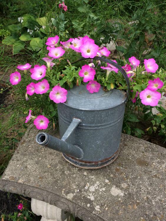 Transform an old watering can into a cheerful and charming planter for your garden. Fill it with soil and bright, blooming petunias to create a splash of color that draws the eye.