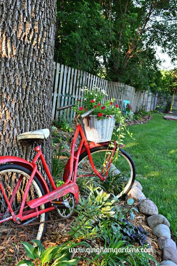 Position the bike near a tree or fence to make it a charming garden focal point. Water carefully to ensure the soil stays healthy without soaking the frame. You can even paint the bike in cheerful tones to match your garden’s color palette.
