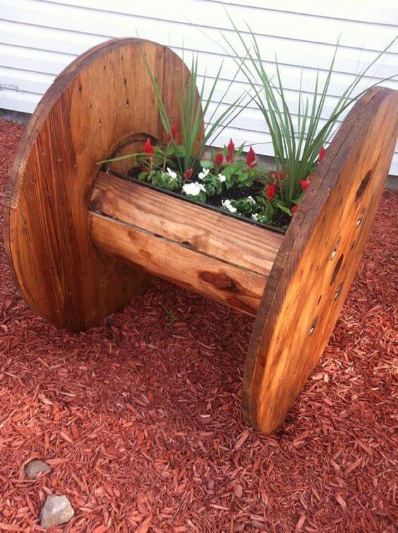Transform an old wooden cable spool into a striking garden centerpiece with this planter idea. The central hollow section makes a perfect bed for flowers and greenery, while the round ends add stability and a rustic charm.