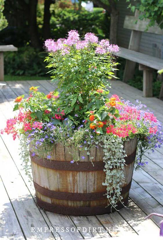Bring a rustic, country-inspired touch to your patio or garden with a barrel flower planter. Its sturdy wooden structure makes it perfect for holding a mix of tall, bushy plants and cascading flowers that spill beautifully over the edges.