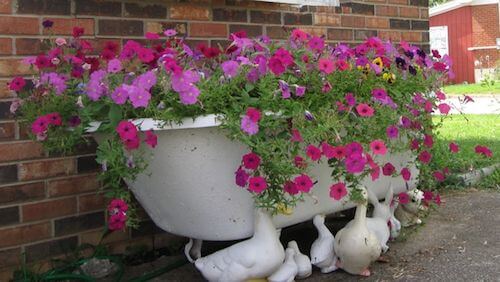 Give an old bathtub a second life as a whimsical flower display in your garden. Its deep basin is ideal for layering soil and planting a variety of flowers that spill over the edges, creating a vibrant cascade of color.