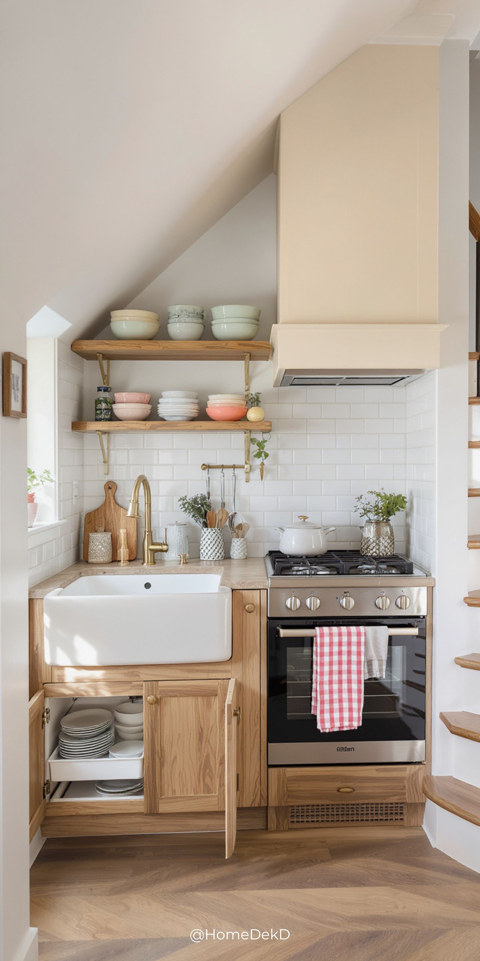 Small Farmhouse Kitchen with Open Shelves Under Staircase