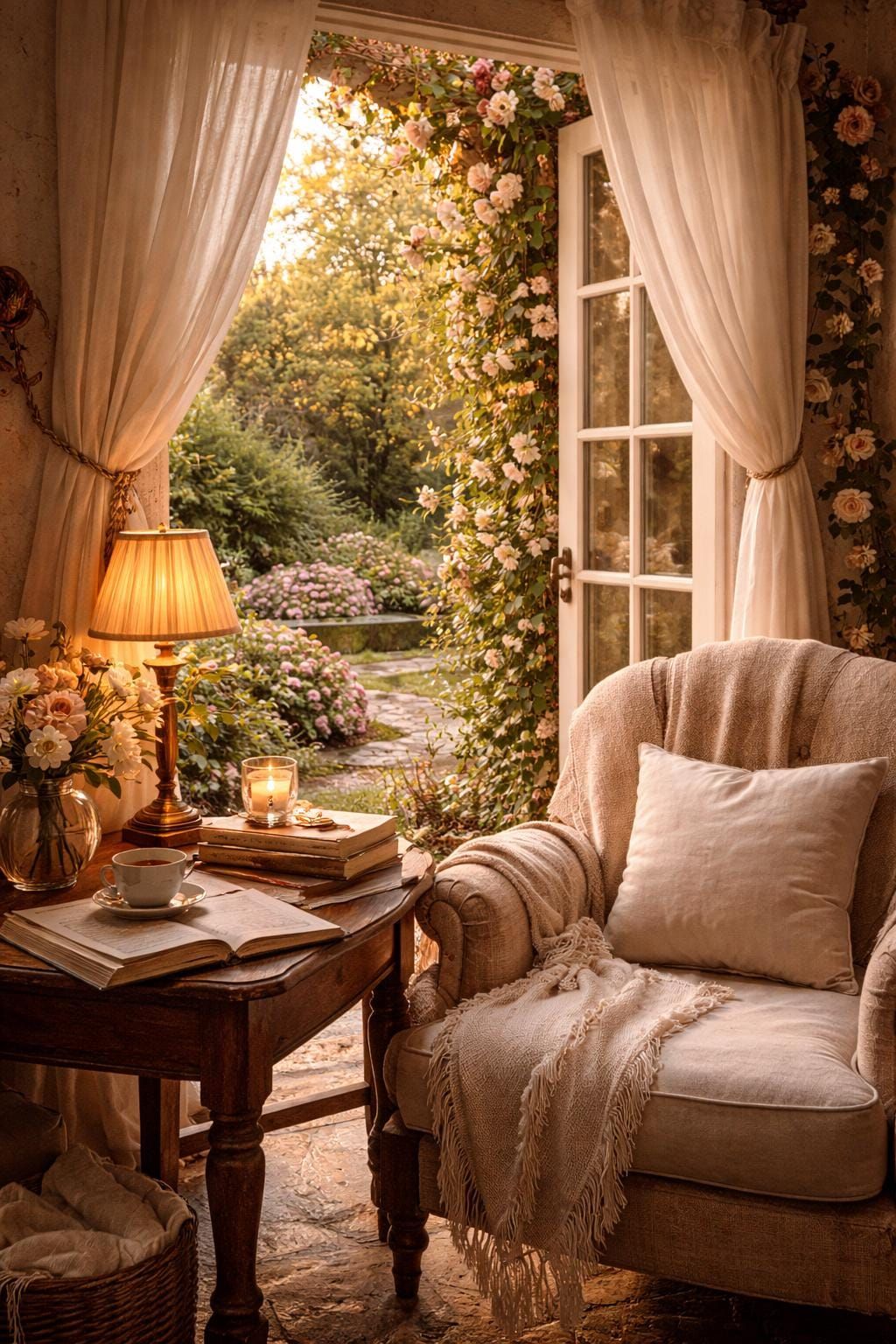 Sonnenbeschienene Leseecke – Gemütliche Cottage-Wandkunst, weiche Gartenästhetik Digitaler Download