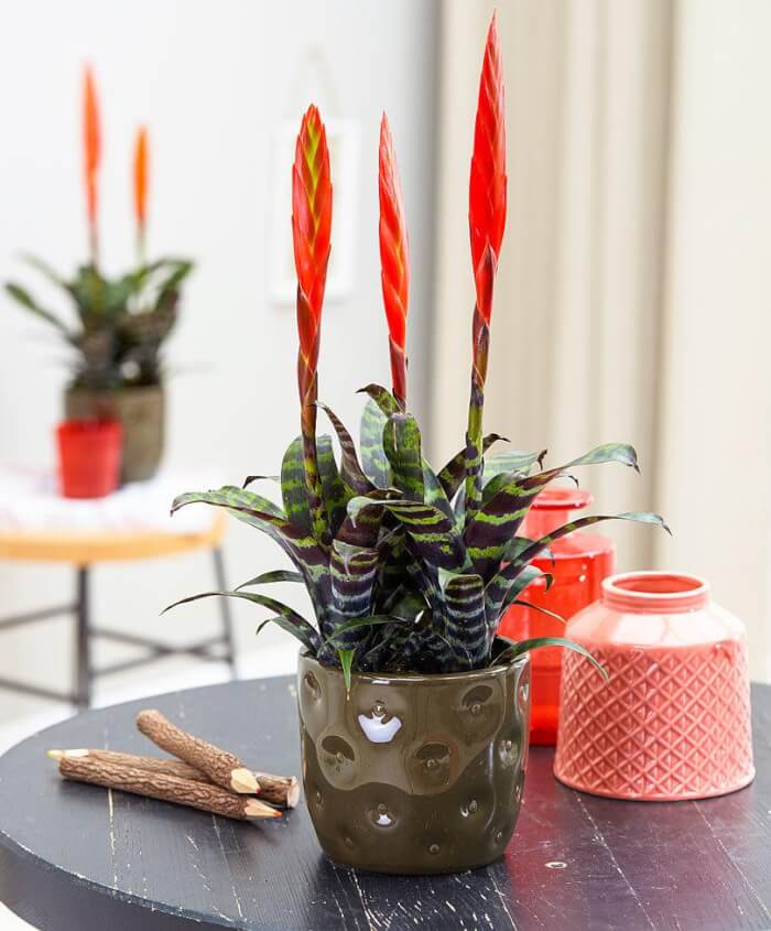 This bromeliad features bold green leaves wrapped in creamy white horizontal stripes. In the right season, it sends up a bright, colorful flower spike that adds even more flair.