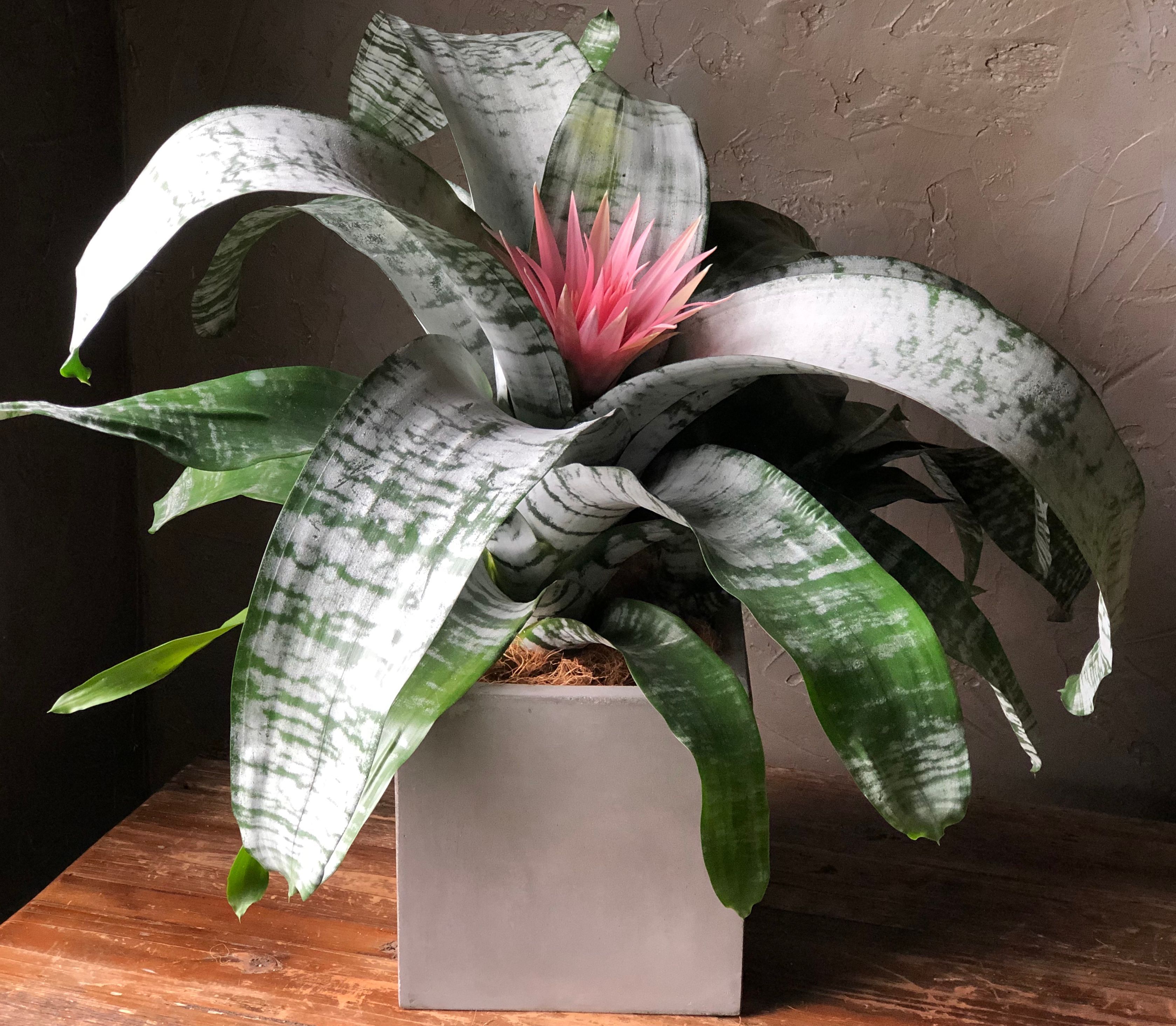 Thick, arching leaves striped in silver and sea green create a cool, elegant look. It pairs beautifully with the pink bracts that emerge during blooming.