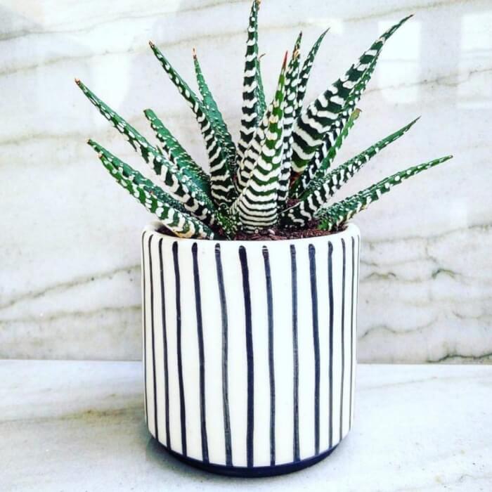 Place it in a small ceramic pot for a minimalist look. If you want its stripes to stay vivid, avoid overwatering and keep it near a sunny window.